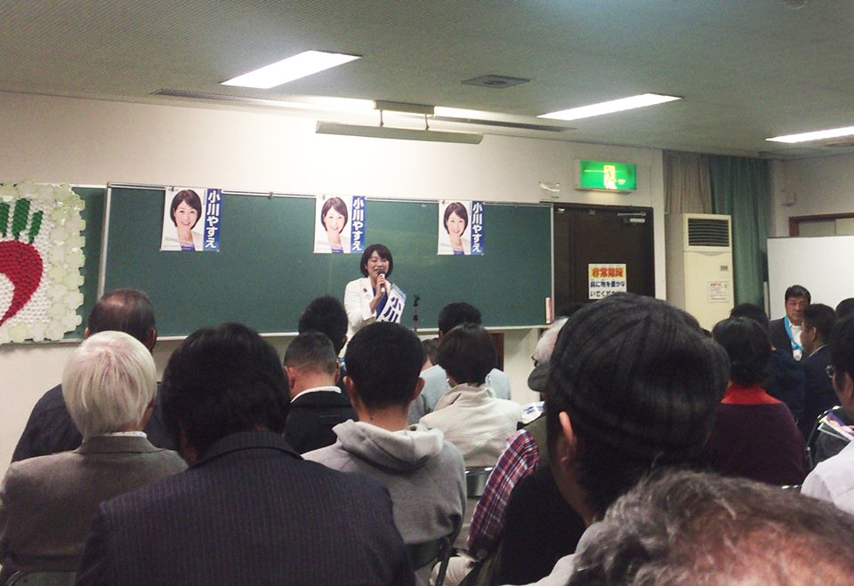 草津市山田まちづくりセンターでの個人演説会では、会場に入り切らないほどたくさんの方が来て下さりました。後援会長をつとめて下さっている元草津市議会議長の山本美智子さんの「平和を守り、人権を守り、それを実行できる人物として小川やすえを応援している」という身に余るお話。あらためて期待に答えなければと身が引き締まる思いです。